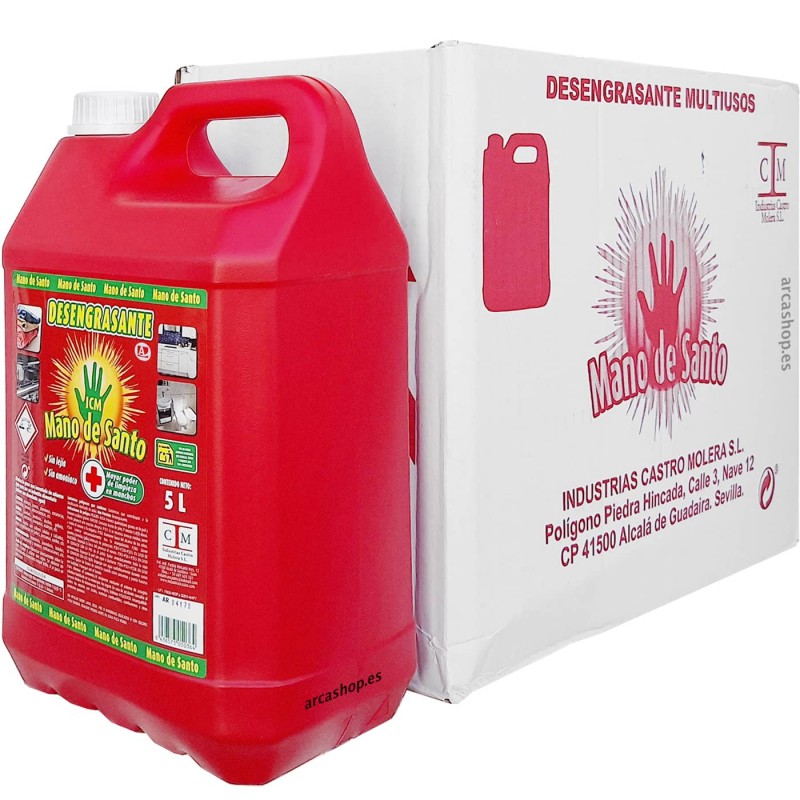 La Caja completa del Desengrasante Mano de Santo 5 litros contiene 3 Garrafas, desengrasante para talleres, empresas y limpieza multiusos, elimina grasas (quitagrasas) y manchas (quitamanchas).
